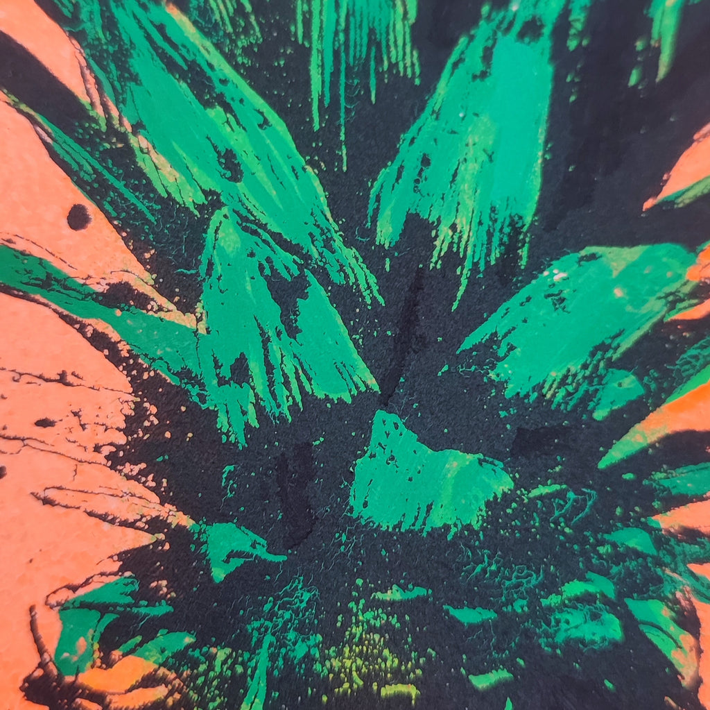 Created through a fascinating mono-print Gel Plate process, each piece a one-of-a-kind work of art, featuring a striking Pineapple set against a bold, orange background with artistic splatters and drips.